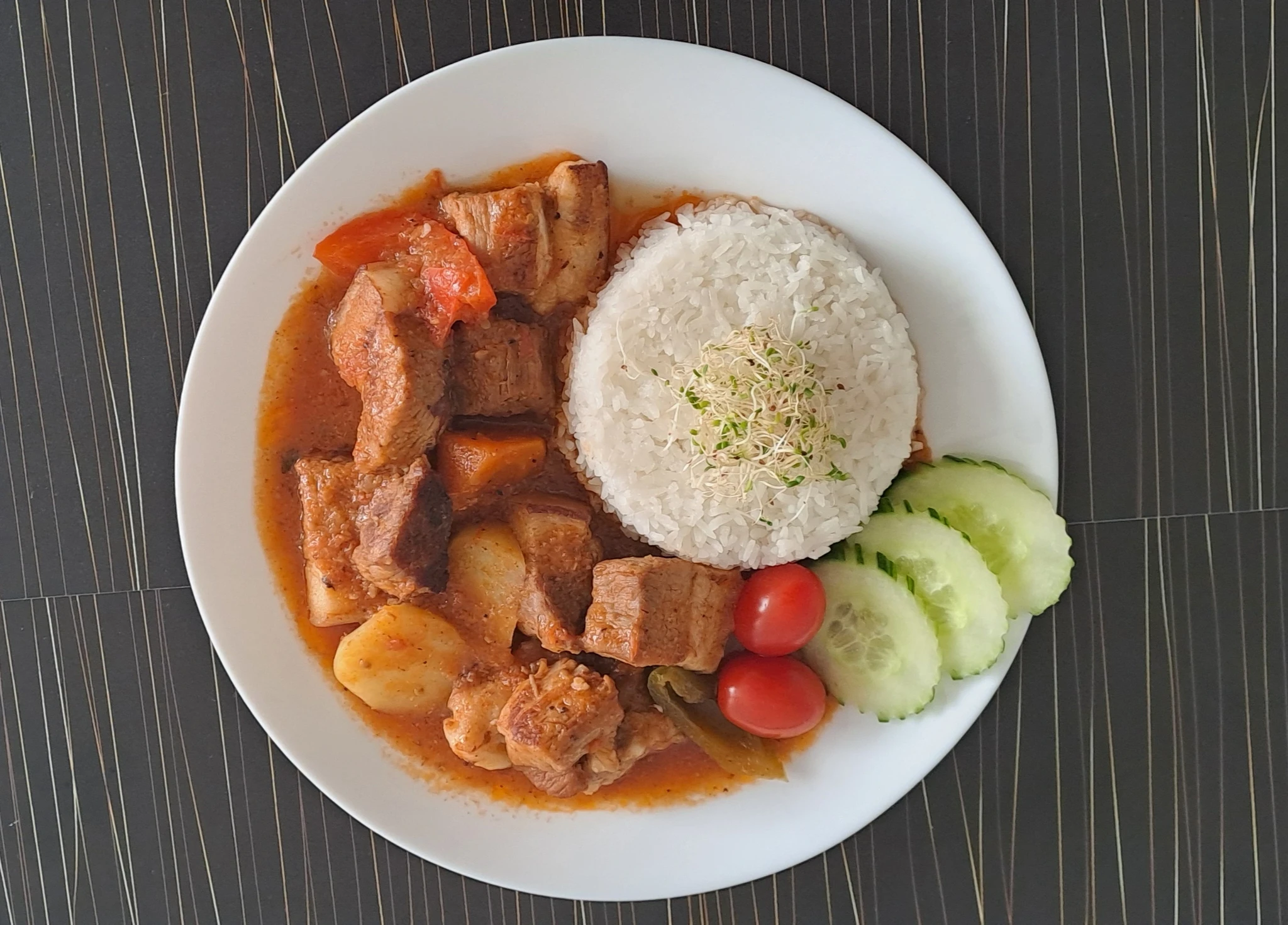 Filipino menudo is a rich pork stew, braised in a delicious, sweet and spicy tomato-based sauce. Served with jasmine rice.