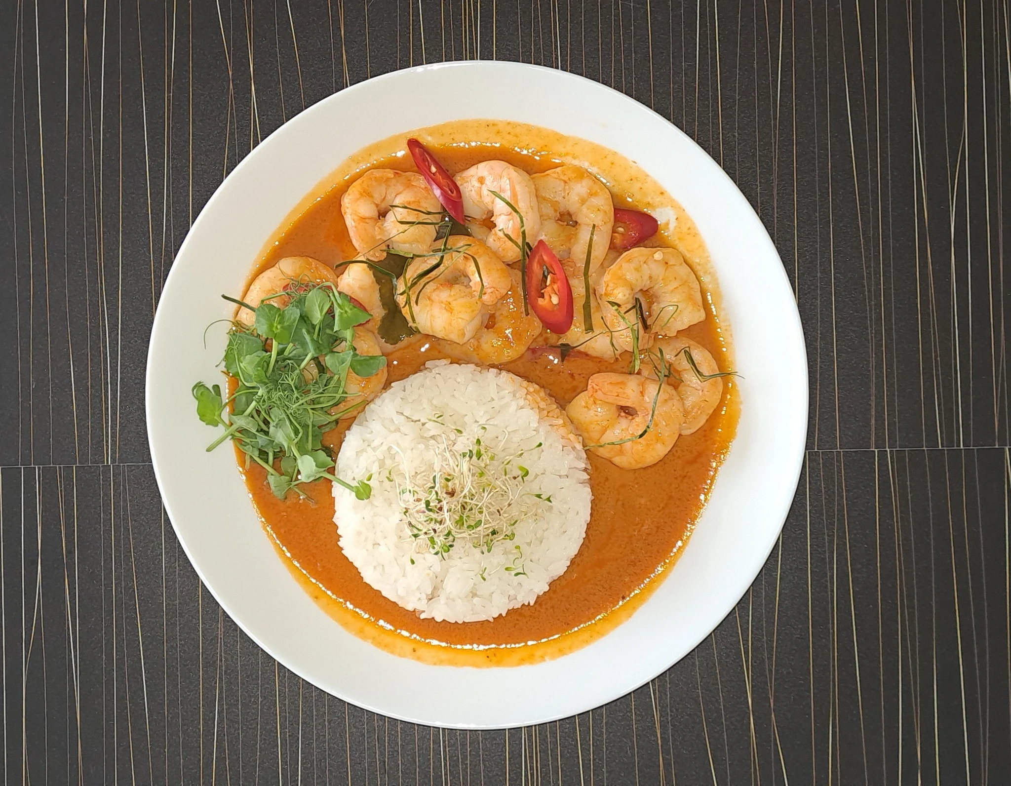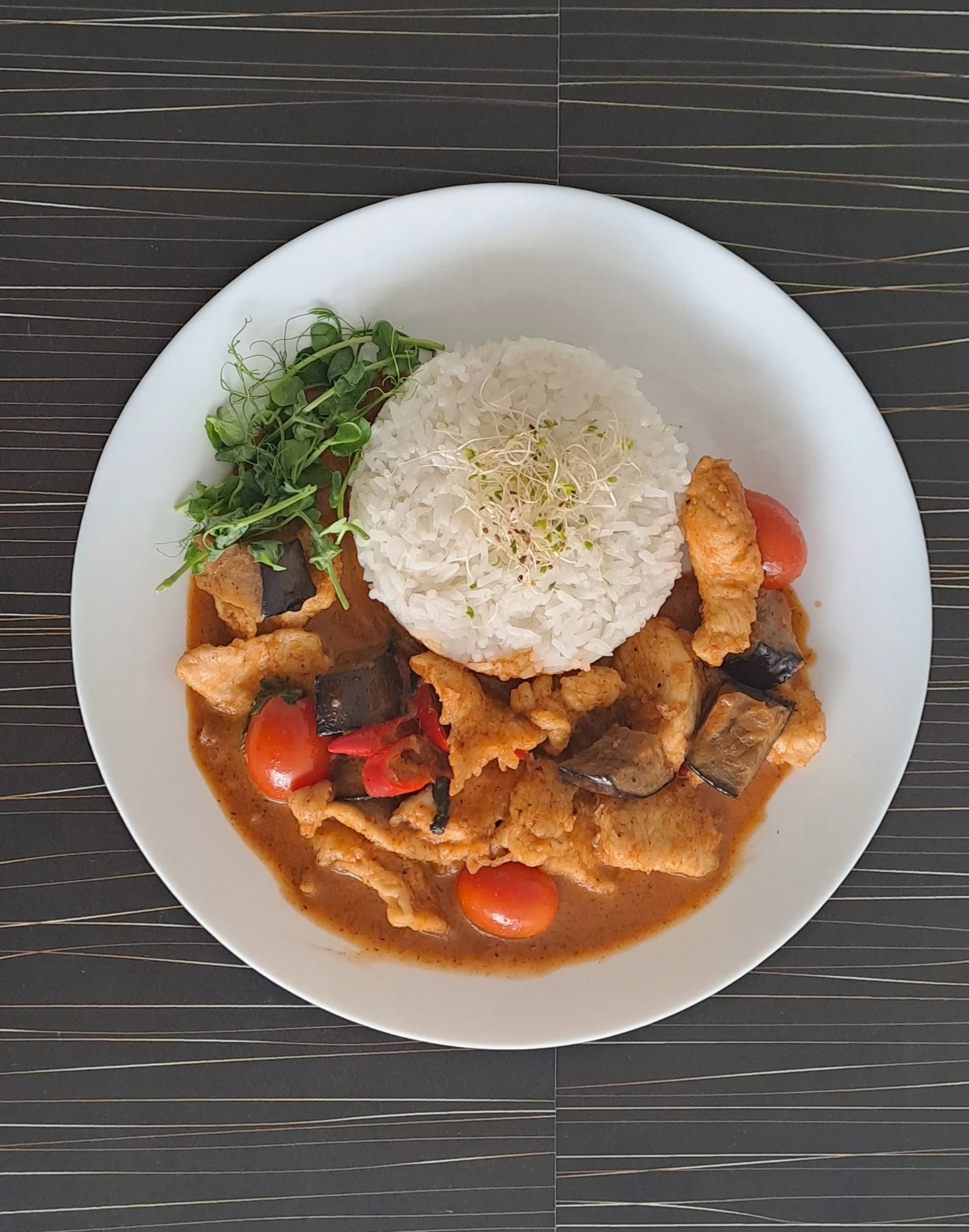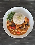 A Thai dish made with coconut milk, consisting of red curry paste, vegetables (eggplant, tomato), pineapple, grapes, and chili. Can be ordered with chicken or prawns, served with jasmine rice.