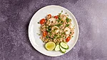 Asian-style fried jasmine rice with legumes and king prawns, with lime and vegetables.