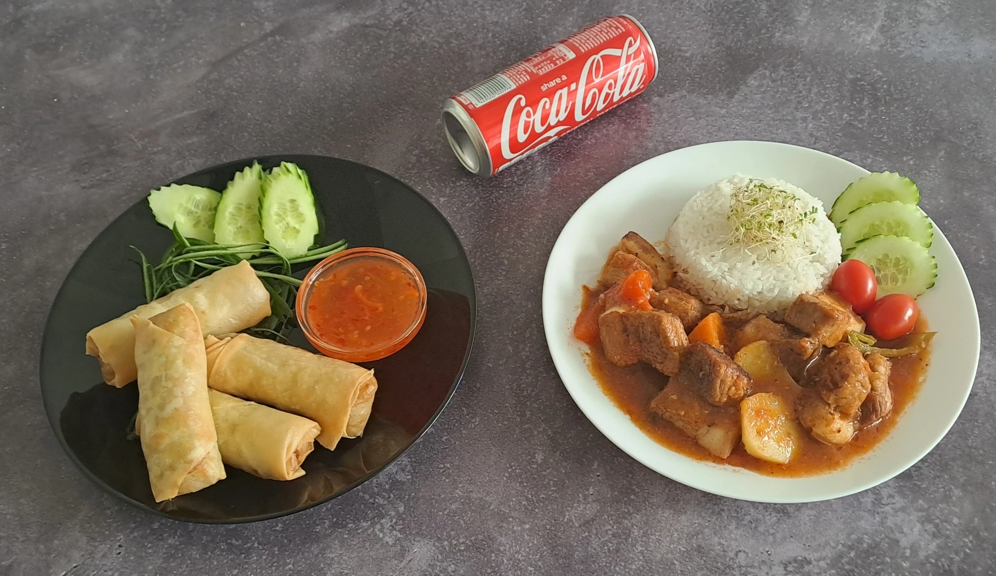 hearty pork stew served with jasmine rice and crispy spring rolls.